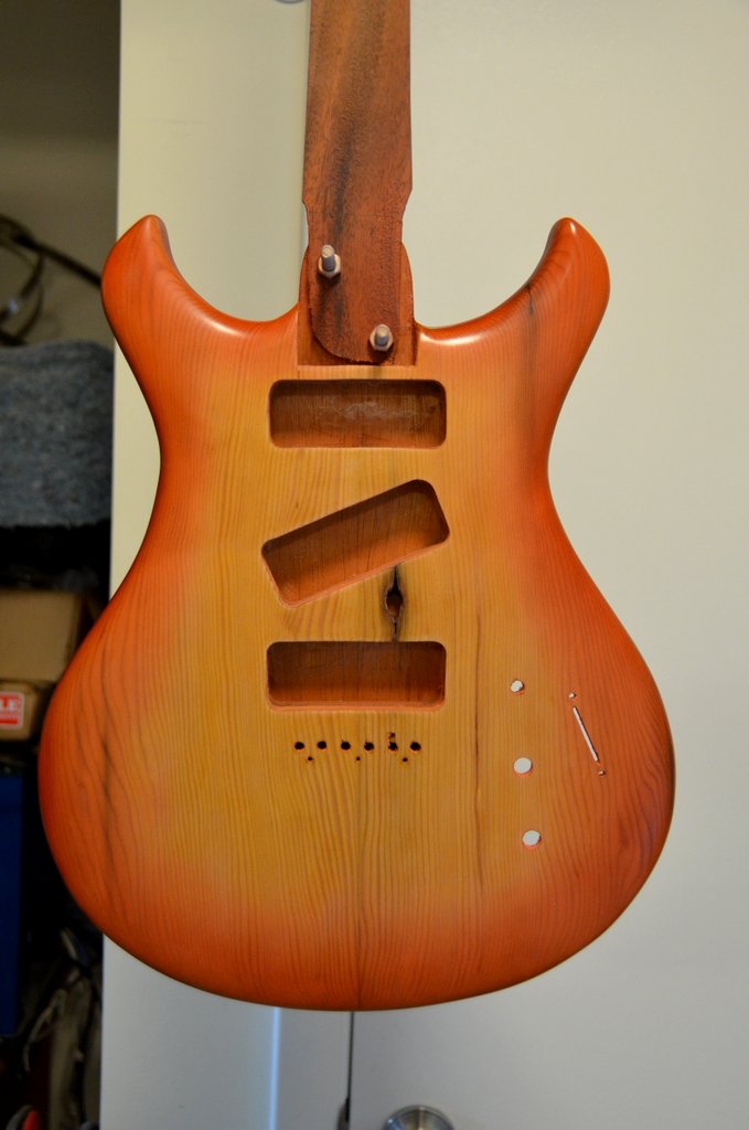 Since I took these photos I’ve cut a control panel cover out of aluminum. The last cover was from 1/8″ copper and really added to the weight of the guitar (Driftwood 1 is 9 pounds 2 ounces with 2 lbs of copper!). I don’t really like the way the aluminum looks but I’ll try to get used to it. I’ve also cut the holes for the switch and pots, and I’ve stained, sanded, and applied CA as a grain filler. I’ve given the guitar one sealer coat. I’m hoping to do a sunburst finish… We’ll see!