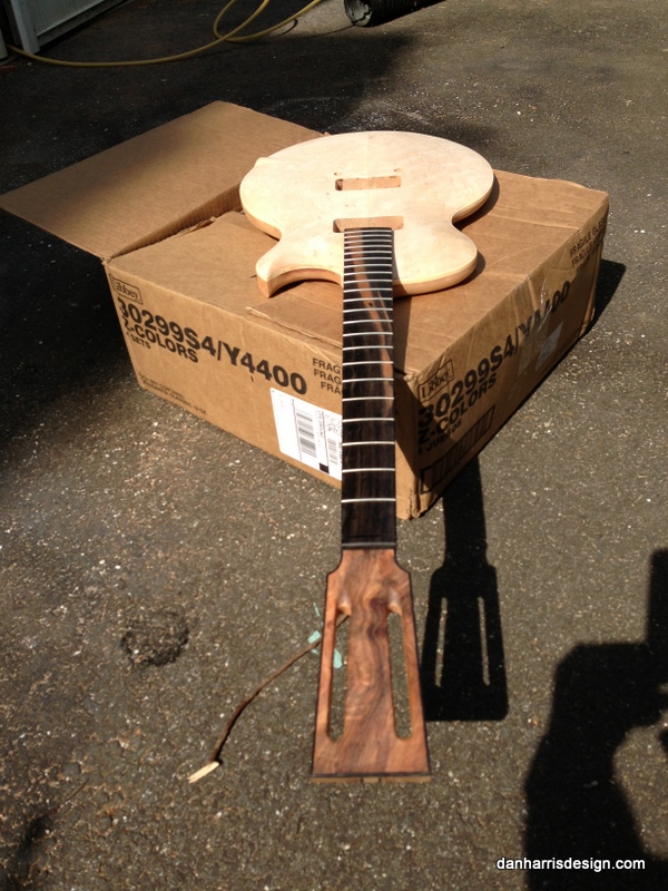 I wanted this to be a really smooth guitar, with lines flowing naturally from one to the next. I spent a lot of time sanding and went back over the course of a week or two refining the curves. For the first time I used my drill press like an arbor press to insert the frets, and did all the frets with the fretboard off the neck. I also decided to bind the neck with ebony so it isn’t readily apparent the neck is bound unless you look closely.