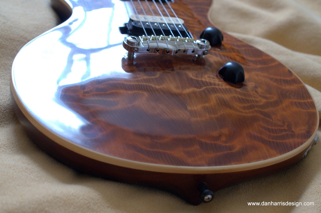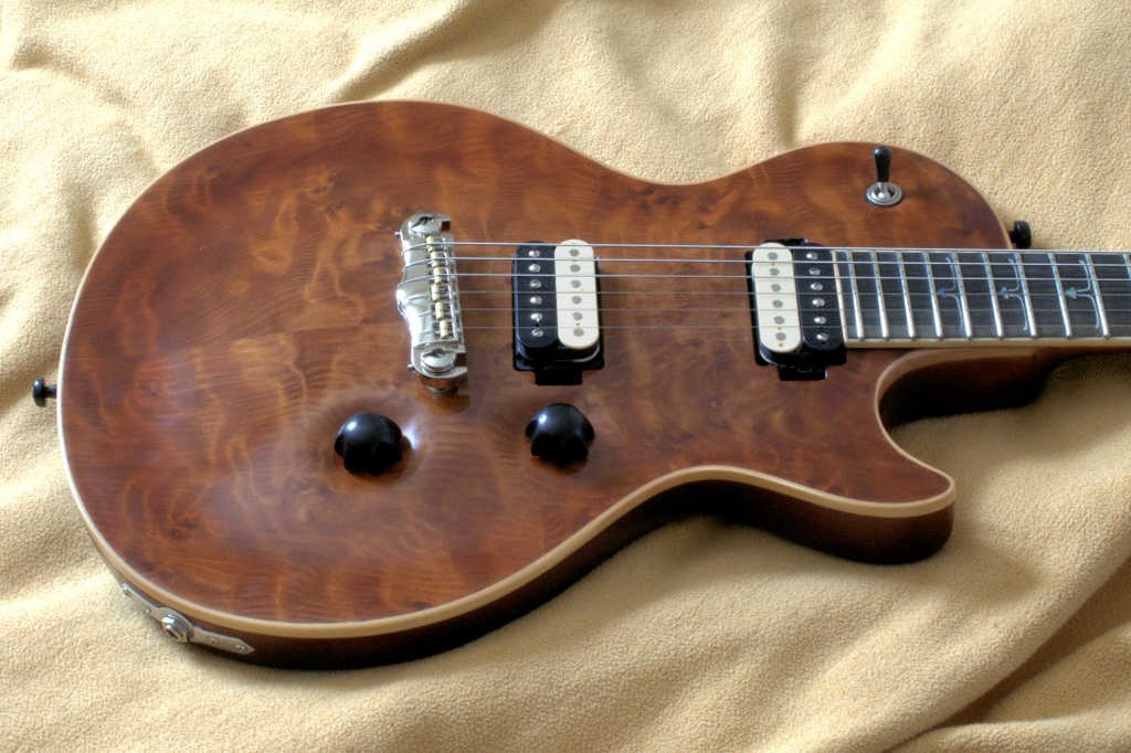 Possibly my most upscale guitar to date, #8 has a beautiful redwood top with mahogany back and neck, and ebony fretboard. I spent a great deal of time working on the inlays, using abalone and mother of pearl. The redwood for the top was cut some 80 years ago and shows amazing figure. I used standard plastic bobbins but wound the pickups as usual on a sewing machine. The pickups are switchable series/parallel using switches in the pots. Home made knobs and switch tip from ebony. I even turned the ebony guitar strap buttons on my mini lathe. I named the guitar “Bohemia” for the European Bohemian movement of the 1800’s, oh, and also for Natty Boh beer!