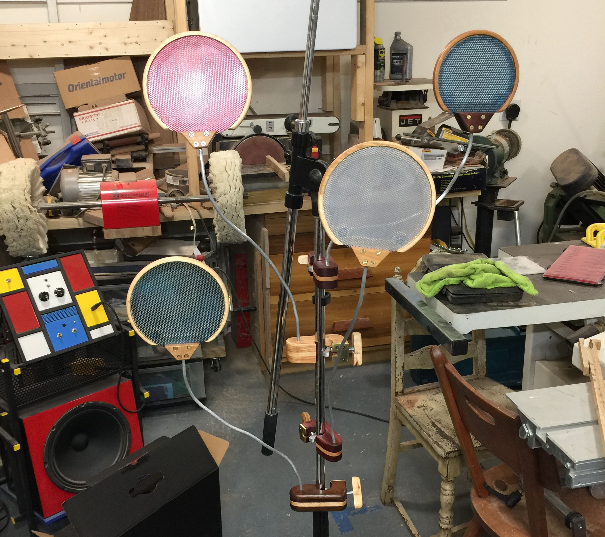 My old pop filter, a beat-up Shure “Popper Stopper”, was really getting gross.  It had numerous runs in the fabric and smelled bad.  There was no way I could use it in good conscience with any singers other than myself.  I decided to design and make my own pop filter using leftover wood from my homemade guitars and some perforated metal I had kicking around.  I fashioned an attractive aluminum and wood clamp mechanism and did some tests, recording my results.  It worked pretty well and was remarkably free of sonic artifacts.  But it wasn’t foolproof- if I really popped a P, or if I got too close to the mic I could still overload the diaphragm.  So I decided to add a removable 2nd stage!  I ordered some 150 micron fabric screen and made a wooden ring with imbedded neodymium magnets so the 2nd stage easily clips to the powder coated steel 1st stage.  Now the gadget really worked for more extreme plosives.