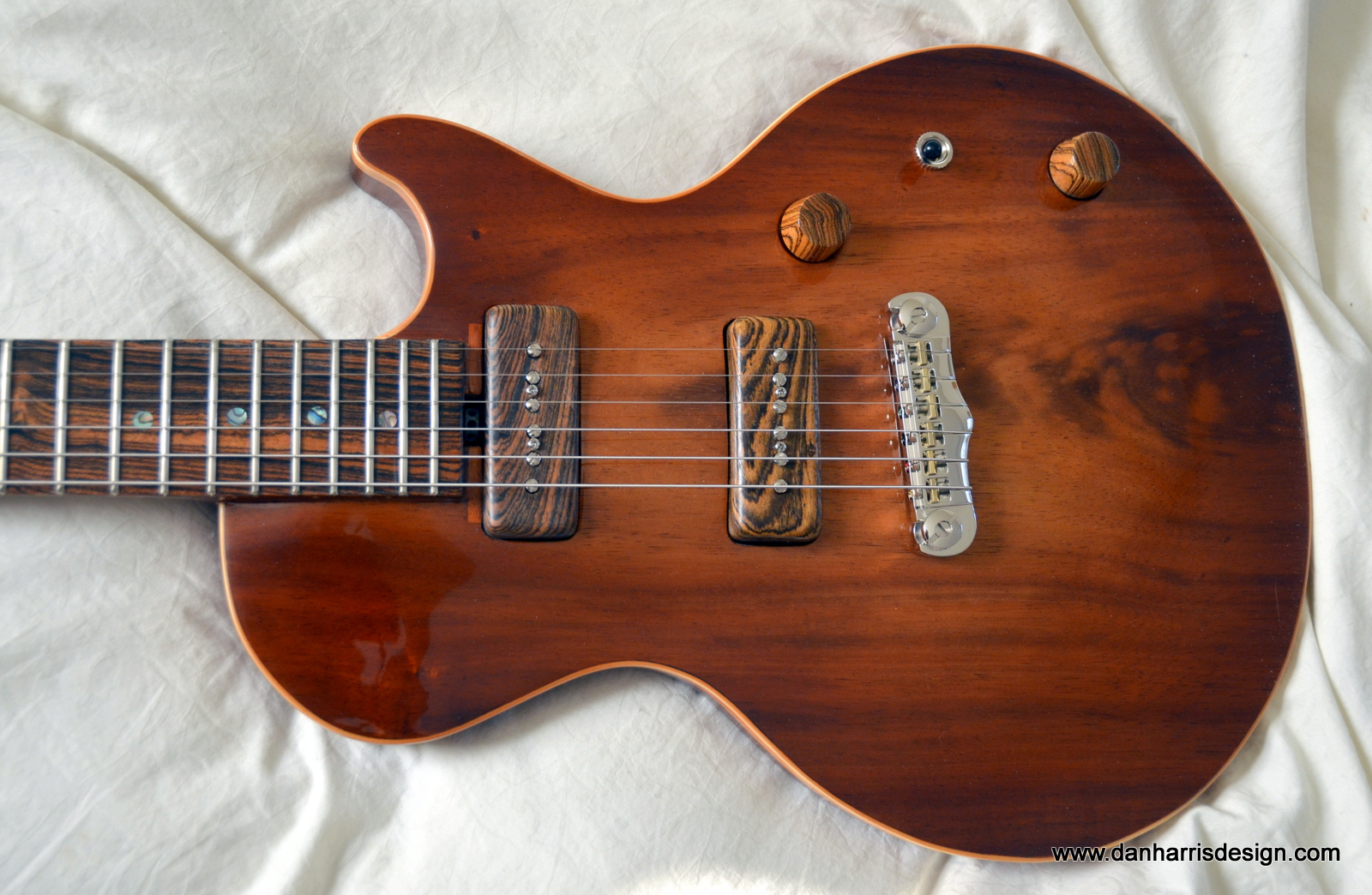 25.5″ scale neck. One piece Koa bound, carved top. One piece curly Brazilian mahogany back. 5 piece koa and walnut glued in neck with deep tenon. Hot hide glue used throughout for all major joinery. Hand wound pickups on hand made Ipe wood bobbins. Hand machined bocote pickup covers. Hand turned bocote knobs. Compound radius (10″-12″) bocote fretboard. Waverly (made in USA) slot head tuners. Translucent buffalo horn nut. Jason Z. Schroeder bridge (made in USA). Abalone shell dots and headstock inlay. Headstock inlay of Hawaiian flying bird petroglyph hand cut and hand seated in koa veneer headstock.
