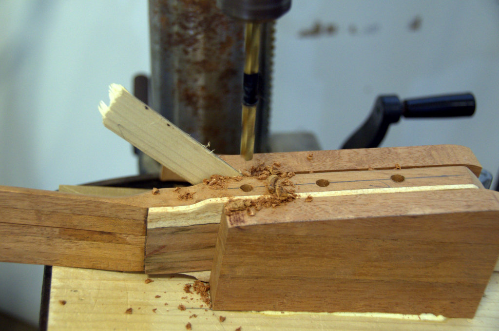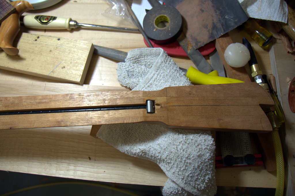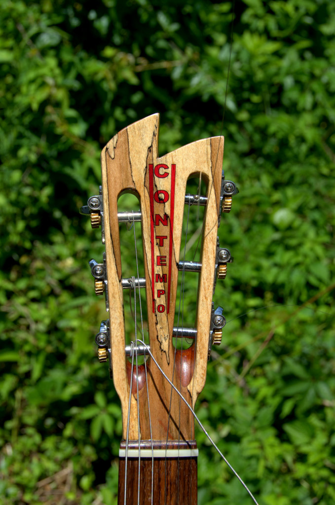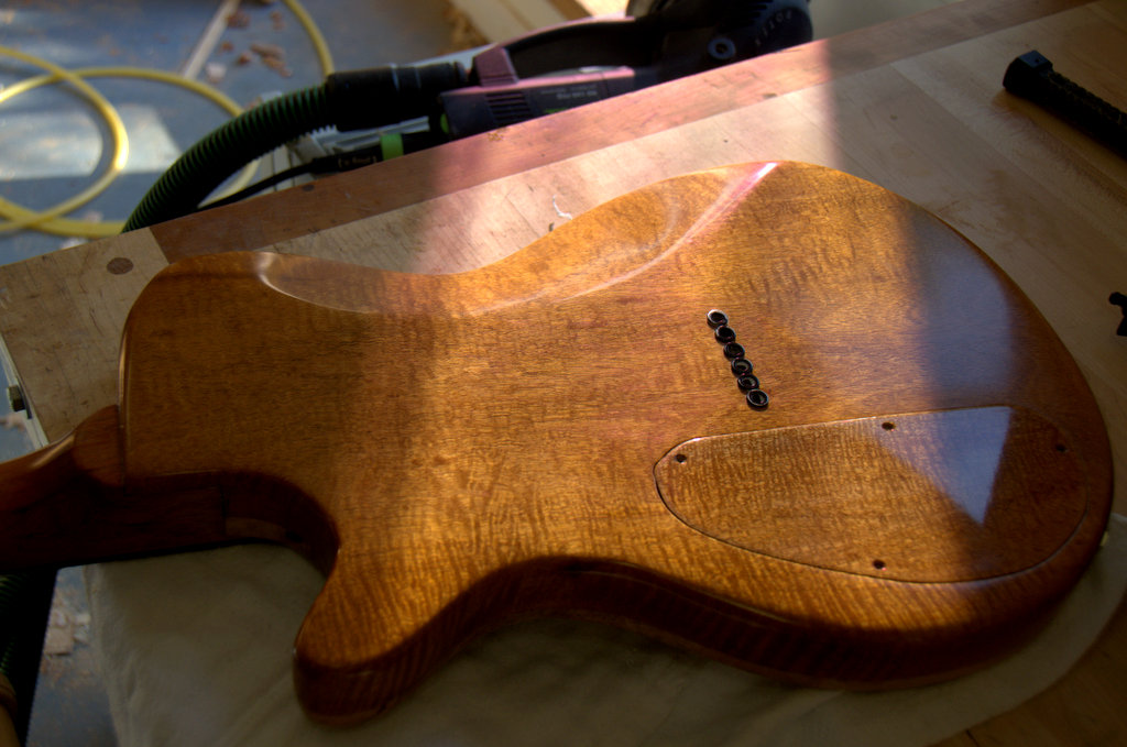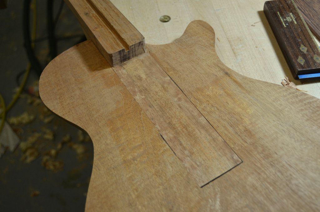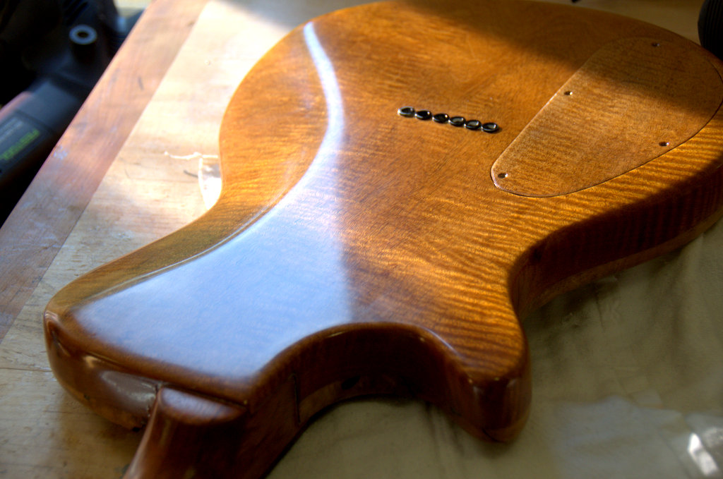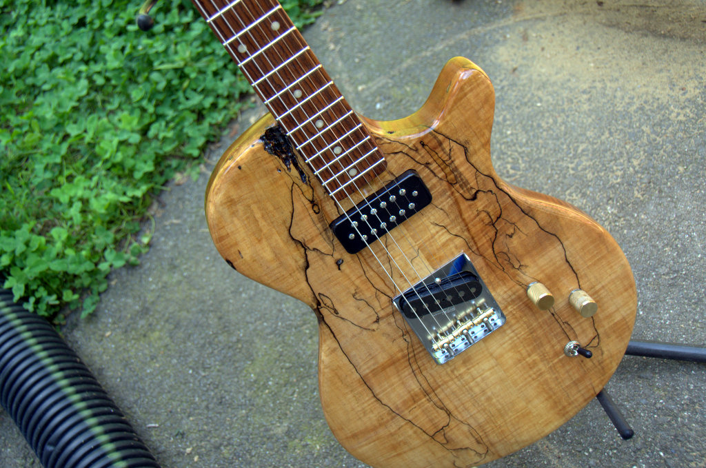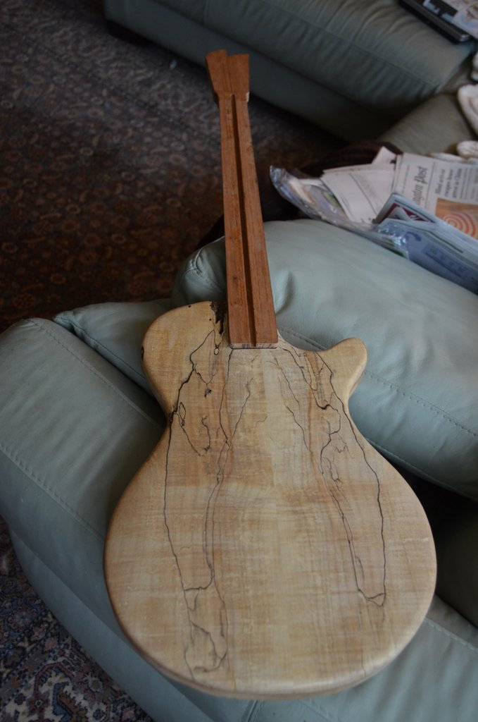I decided to make a slothead set neck guitar and chose a body shape that combines elements from my 1960 Gretsch Jet Firebird with my ’55 LP Special. The neck joint goes all the way to the bridge, which is supposed to improve sustain and resonance. I think the wood plays an important role in resonance too- I chose curly mahogany for the body and spalted maple for the top. I had the mahogany in my shed for over ten years, wondering what I was going to do with such a nice piece of wood. I still have enough for perhaps four guitar bodies.