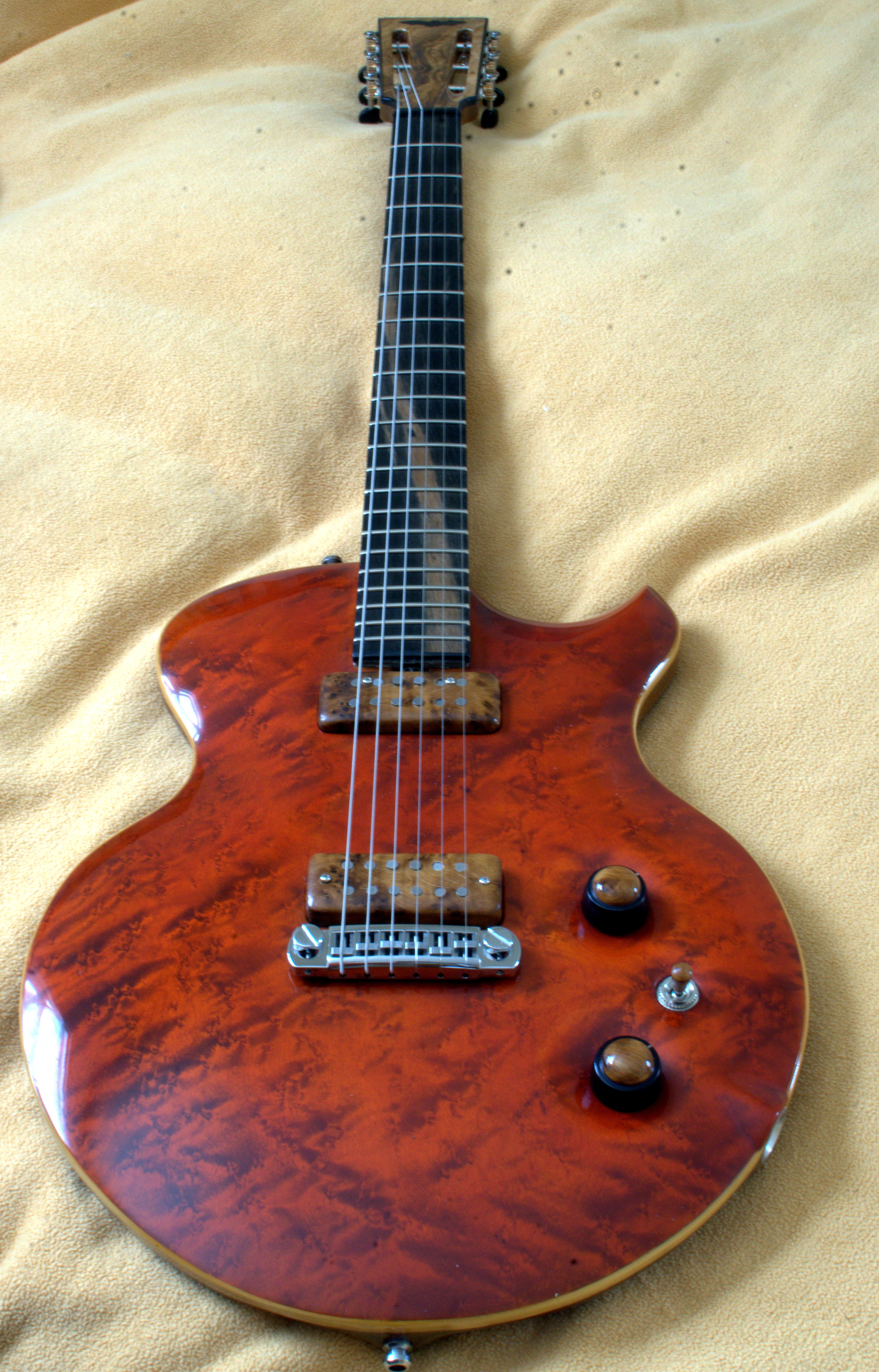 pickups- homemade double coil humbuckers in P-90 size. Thuya burl covers.