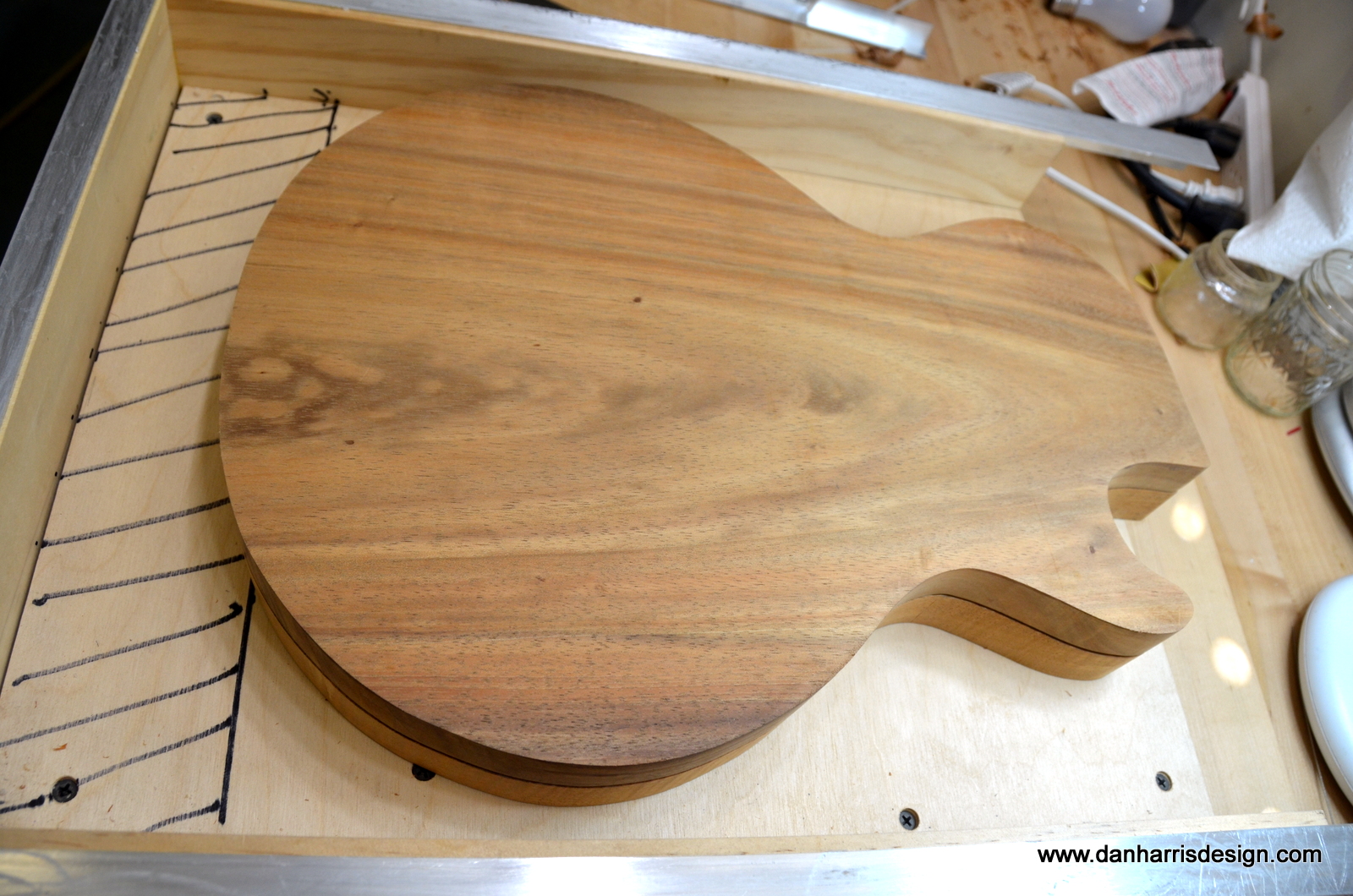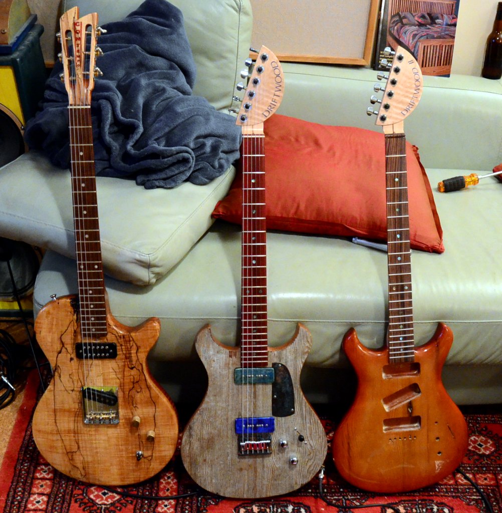 I wanted to take advantage of the 1/2″ top (Driftwood 1 was only 1/4″), so I “carved” (or actually shaped with a sander) this top and I’m happy with the way it looks. I didn’t want to do the usual PRS or Gibson type of carve and instead opted for a “puffy” look. I’m going to explore this further in future guitar projects.