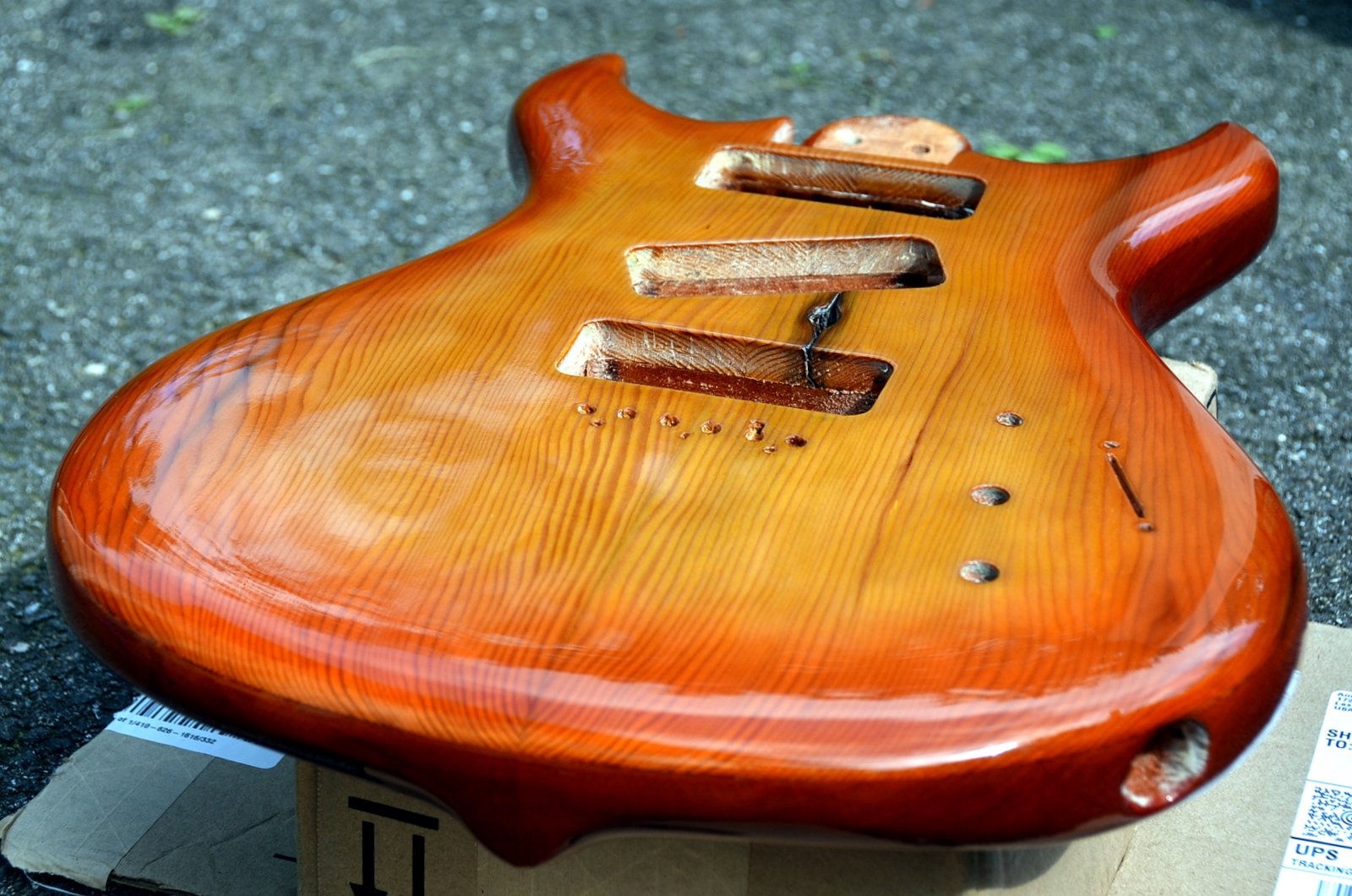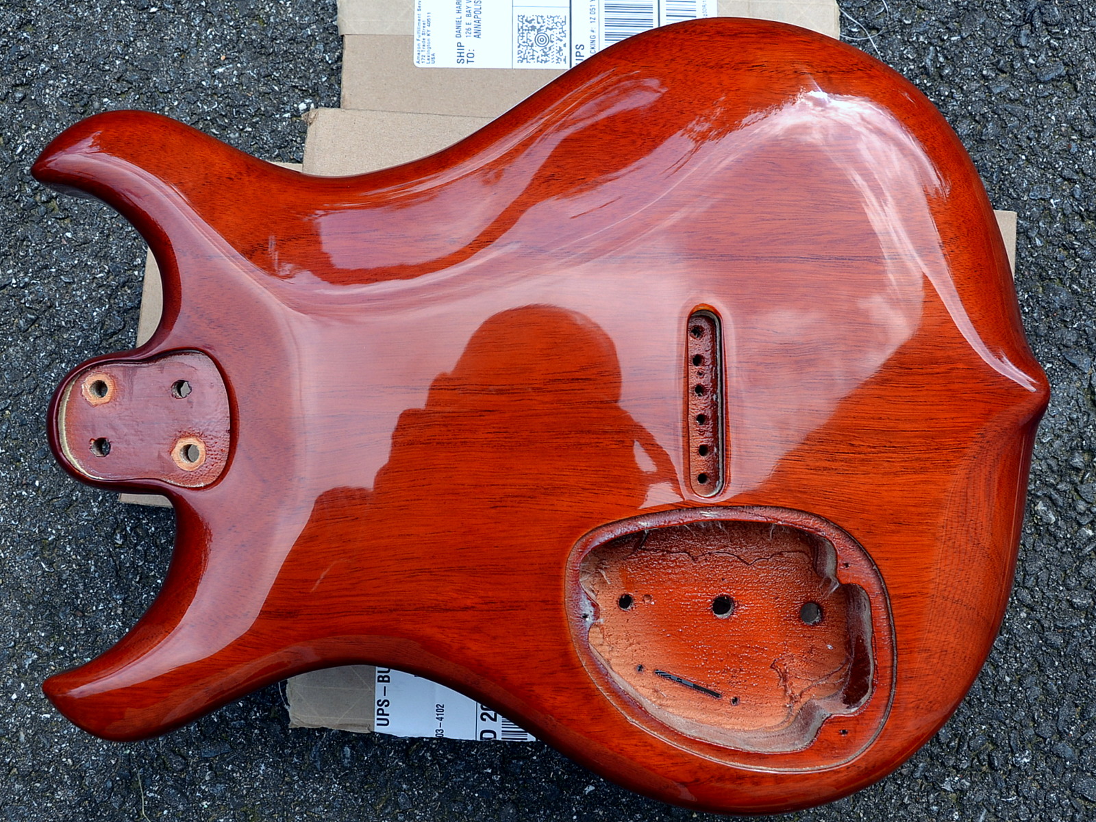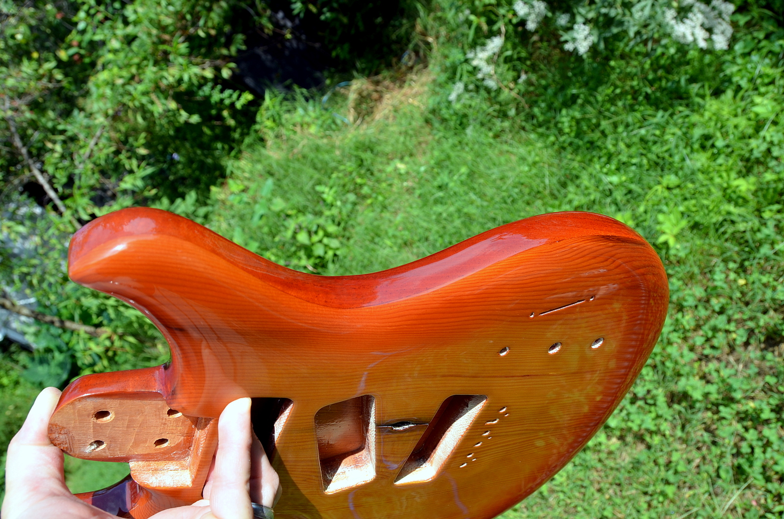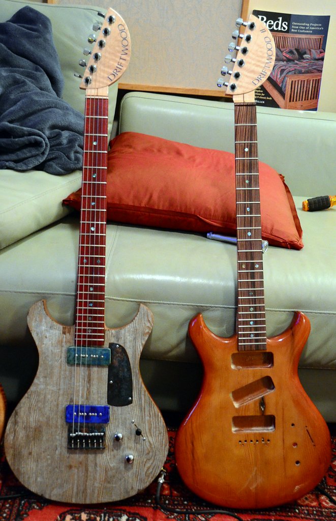 Since I took these photos I’ve cut a control panel cover out of aluminum. The last cover was from 1/8″ copper and really added to the weight of the guitar (Driftwood 1 is 9 pounds 2 ounces with 2 lbs of copper!). I don’t really like the way the aluminum looks but I’ll try to get used to it. I’ve also cut the holes for the switch and pots, and I’ve stained, sanded, and applied CA as a grain filler. I’ve given the guitar one sealer coat. I’m hoping to do a sunburst finish… We’ll see!
