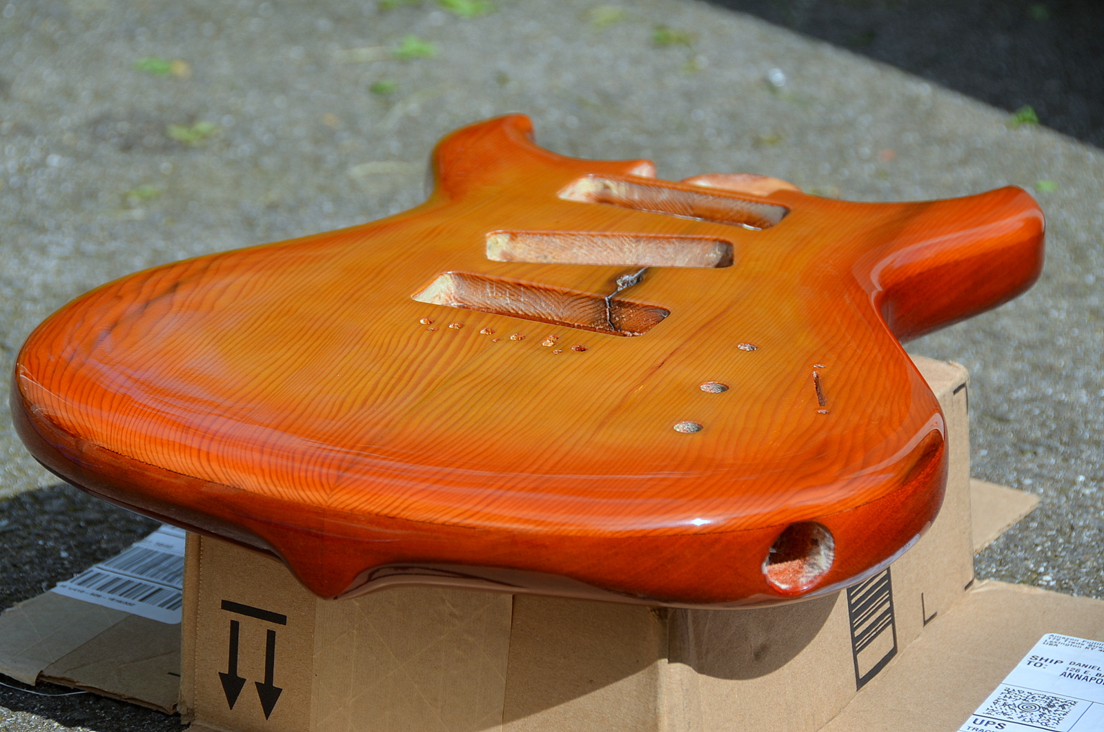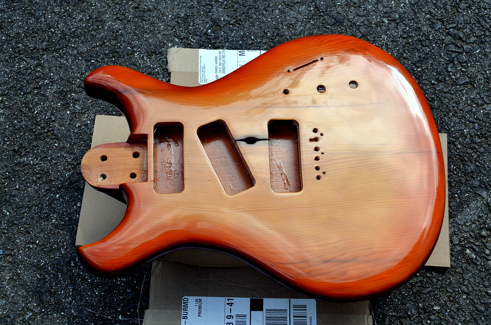 Keep in mind that this is just the raw lacquer, two coats so far, no clear coat, and I’ll probably do a third coat of color before I start clear coating. But, hey, it looks pretty good! I looked to honeyburst finishes from Ernie Ball and Gibson for color inspiration, and I found some pics of Warmoth bodies that had nice sunbursts too. I’m doing just the front in sunburst. The Brazilian mahogany back is getting an even, darker finish. My old Stratocaster has sunburst on both sides, but this guitar, like a PRS is a front-only sunburst.