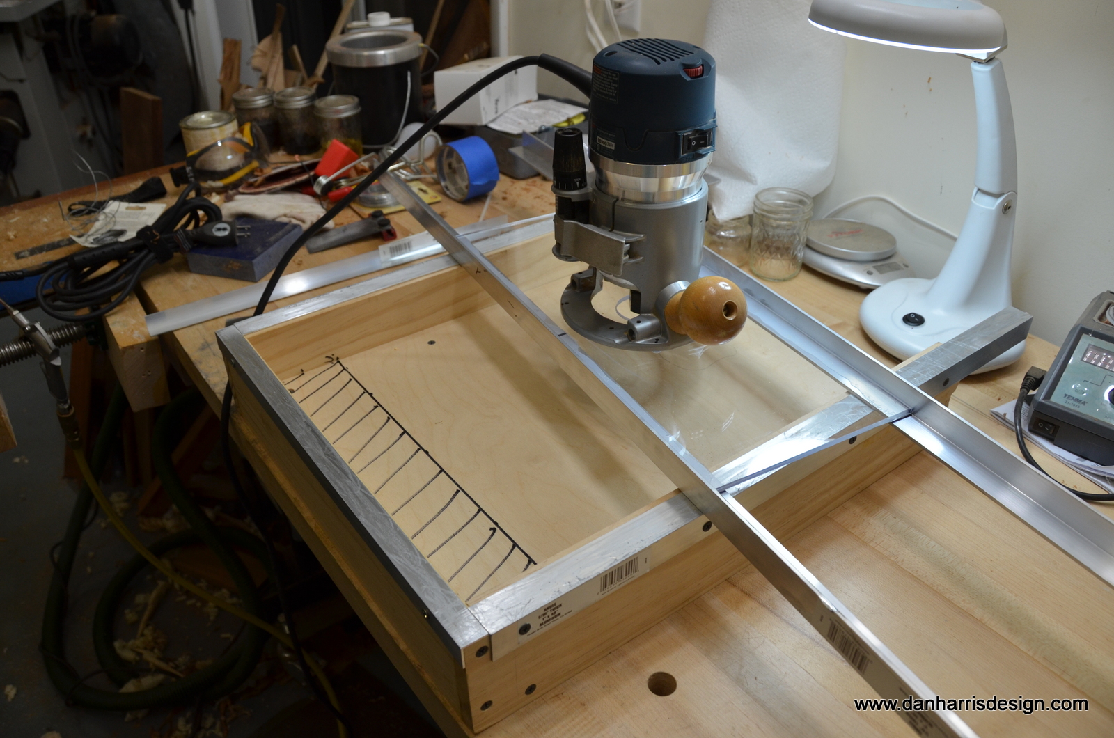 Deriving inspiration from a youtube video, I put together a jig for applying a compound radius to my fretboard blanks. I found a video that uses a similar technique for roughing out the back of a guitar neck. Thinking about it I couldn’t see why one couldn’t specify different radii for each end of a fretboard. I ordered a planing cutterhead for the shaper on the Minimax and made the jig shown here:
