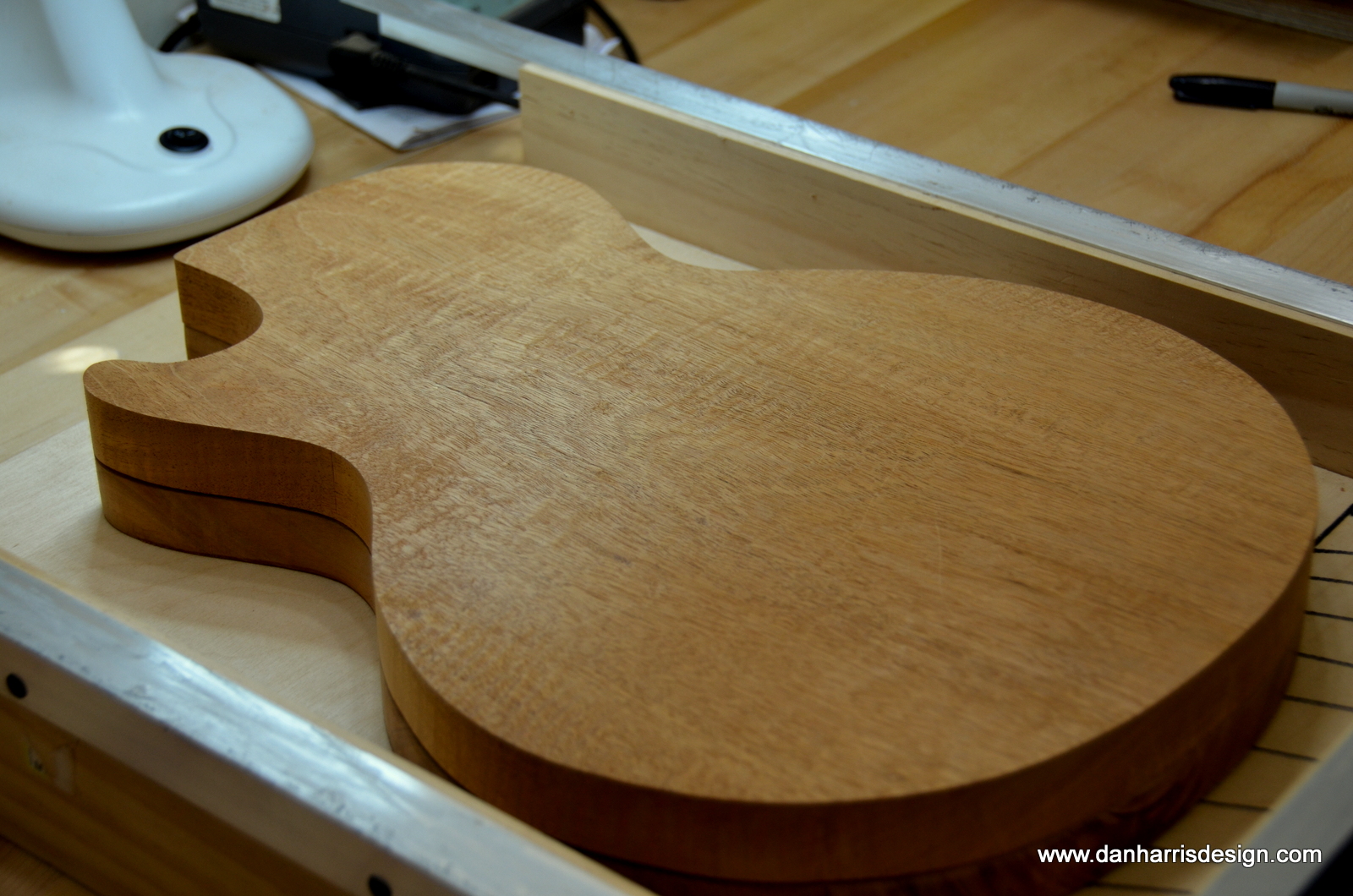 Pretty cool, huh? Just getting started but here’s the front and back- Koa and figured mahogany. And this is just one slab of each wood, no bookmatching- ought to be very resonant: